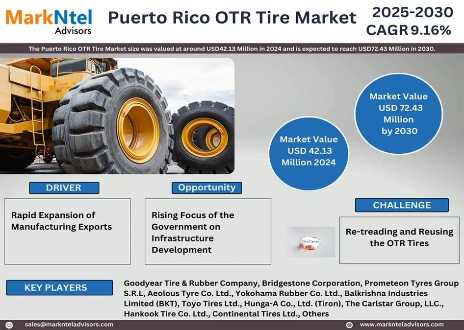 As per recent study by MarkNtel Advisors The Puerto Rico OTR Tire Market size was valued at around USD 42.13 Million in 2024 and is expected to reach USD 72.43 Million in 2030. Along with this, the market is estimated to grow at a CAGR of around 9.16% during the forecast period, i.e., 2025-30.