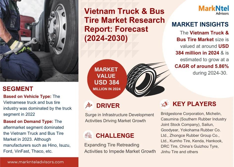 As per recent study by MarkNtel Advisors The Vietnam Truck & Bus Tire Market size is valued at around USD 384 million in 2024 & is estimated to grow at a CAGR of around 5.86% during the forecast period, i.e., 2024-30.